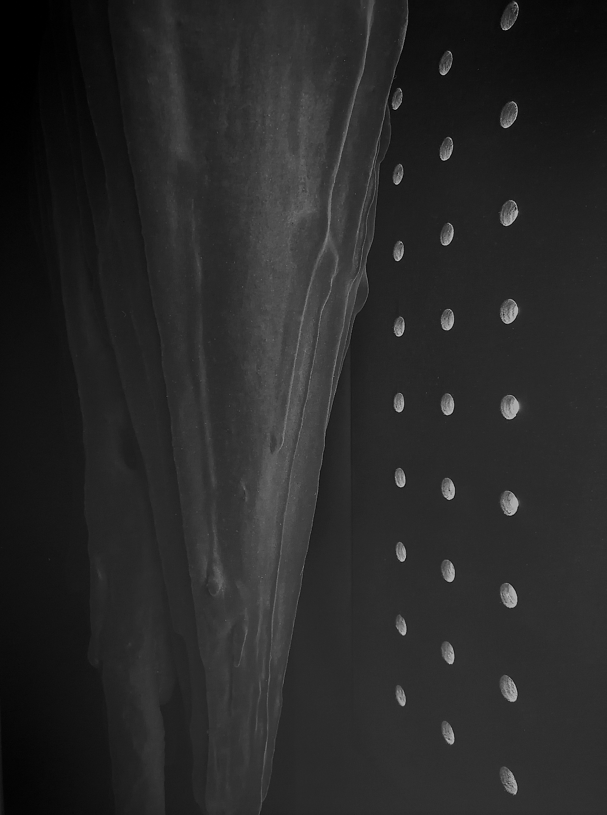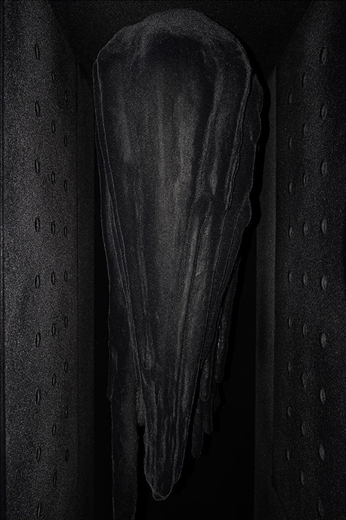 Opening the doors of the upright coffin reveals a vaginal or tongue-like form whose skin has been overwritten with flock filaments— very short fibres used to form a velvety, protective covering on paper mȃché in patterns mimicking data-pathways or bioinformatic glyphs. But the awful sonic signal that Endling emits as soon as it is approached by the audience —Endling’s “speech”— is irreducible to intelligible units.